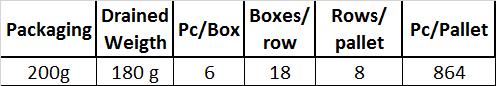 Logistic data for different packages of Marinated Olives in VACCUUM GLASS